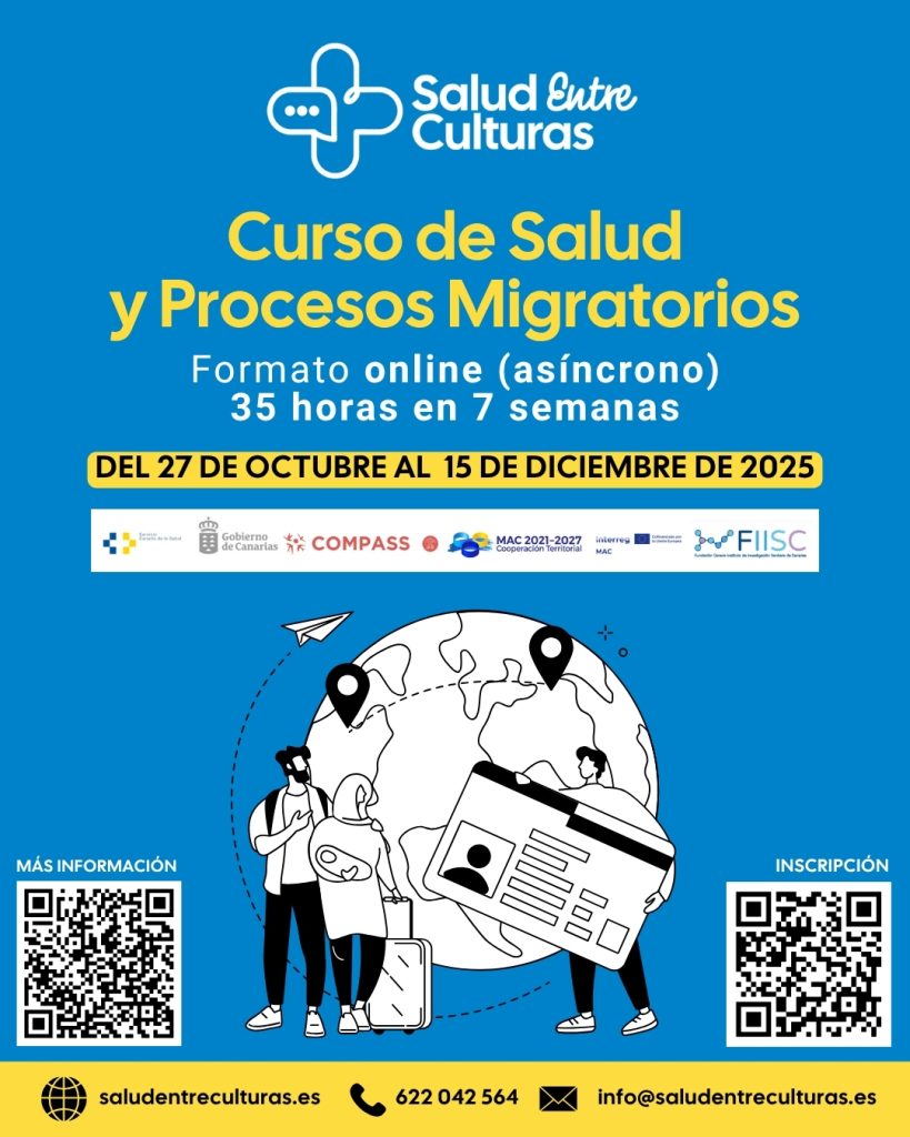 El Curso de Salud y Procesos Migratorios ofrece los conocimientos y las competencias culturales básicas para mejorar la atención sanitaria a población migrada a Canarias, abordando la interculturalidad en el ámbito de los servicios sanitarios públicos.